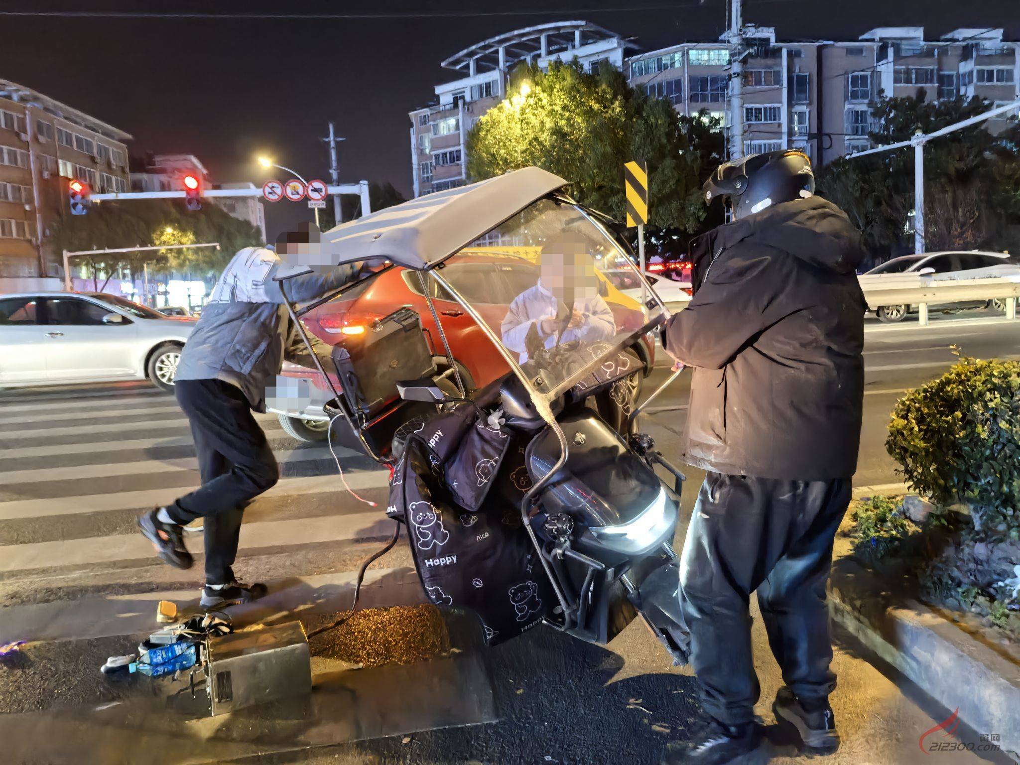 刚刚三院这的十字路口发生一起碰擦,电动车倒地,不过人没事,汽车车主帮着一起把车子扶了起来。