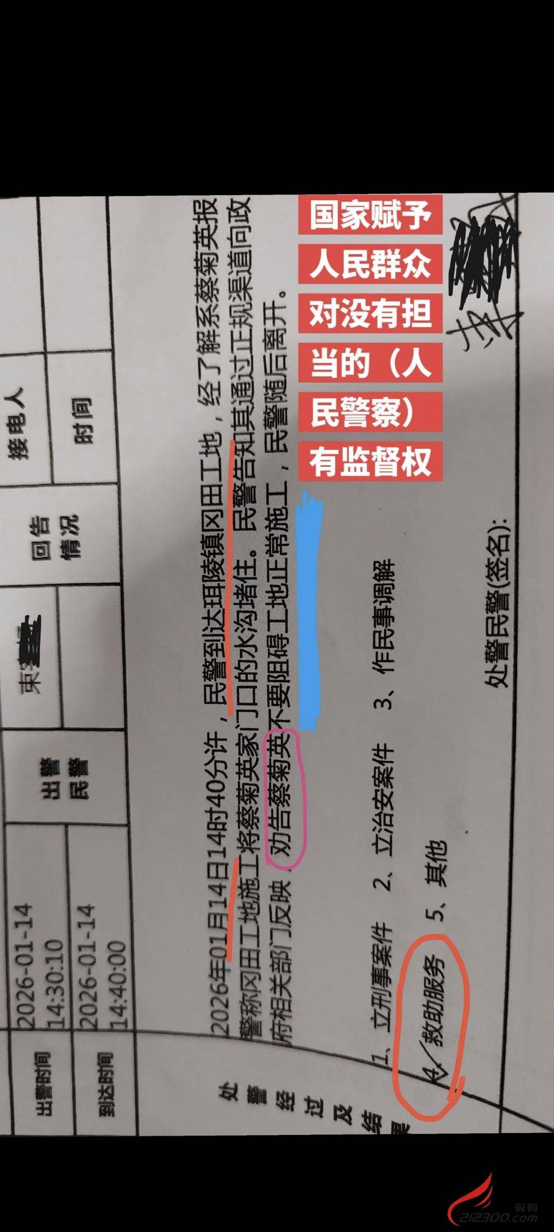 珥陵派出所关于民生问题报警救助公安却推委。但劝告蔡菊英不要阻止施工方动工,却用权
