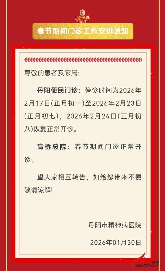 【通知】关于丹阳市第四人民医院2026年春节放假期间的门诊安排