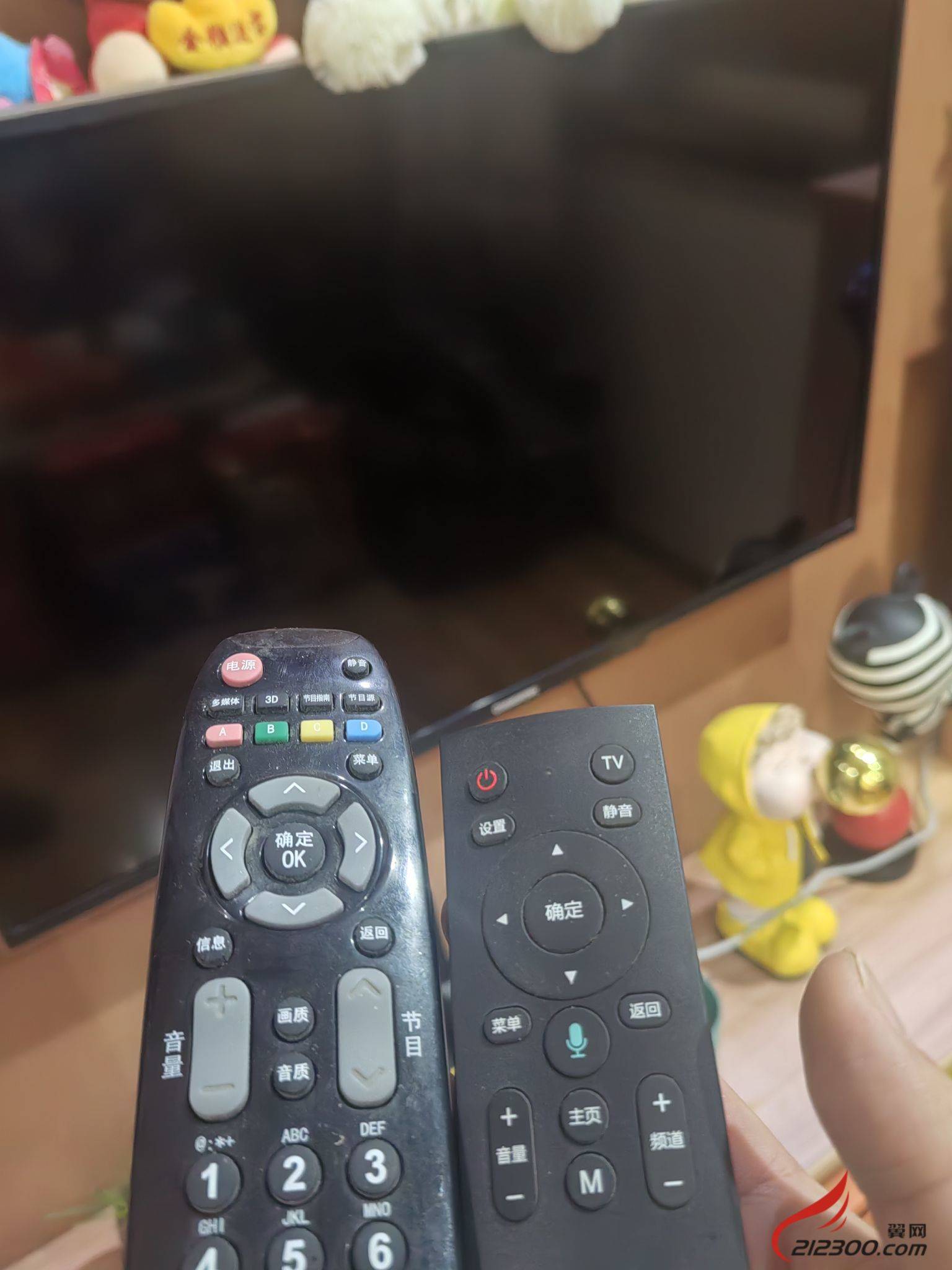 电视遥控器把电视开过来,然后切换信源后再用另外一个遥控器