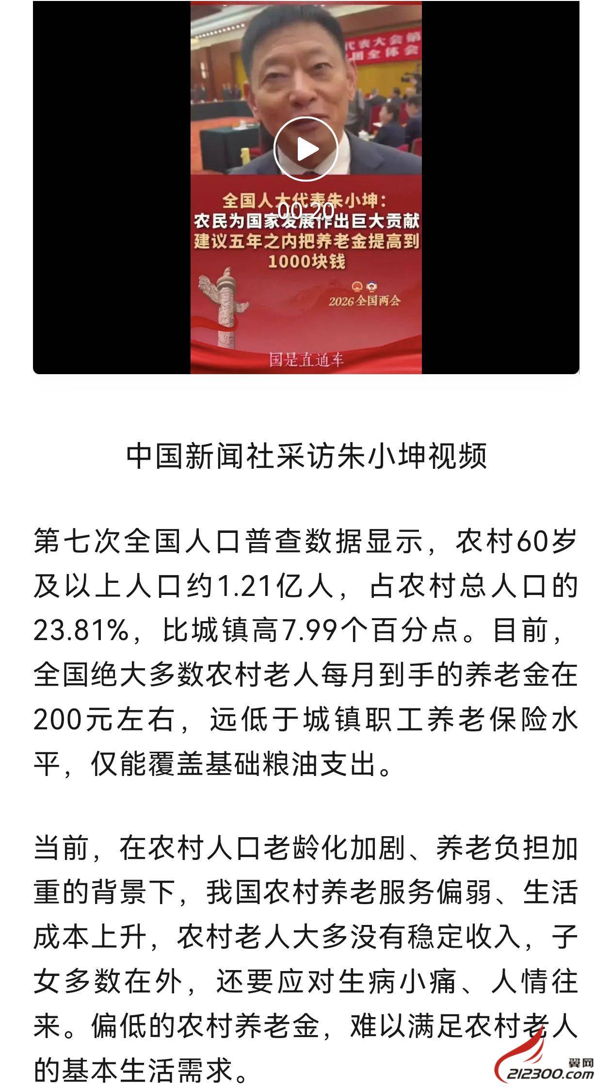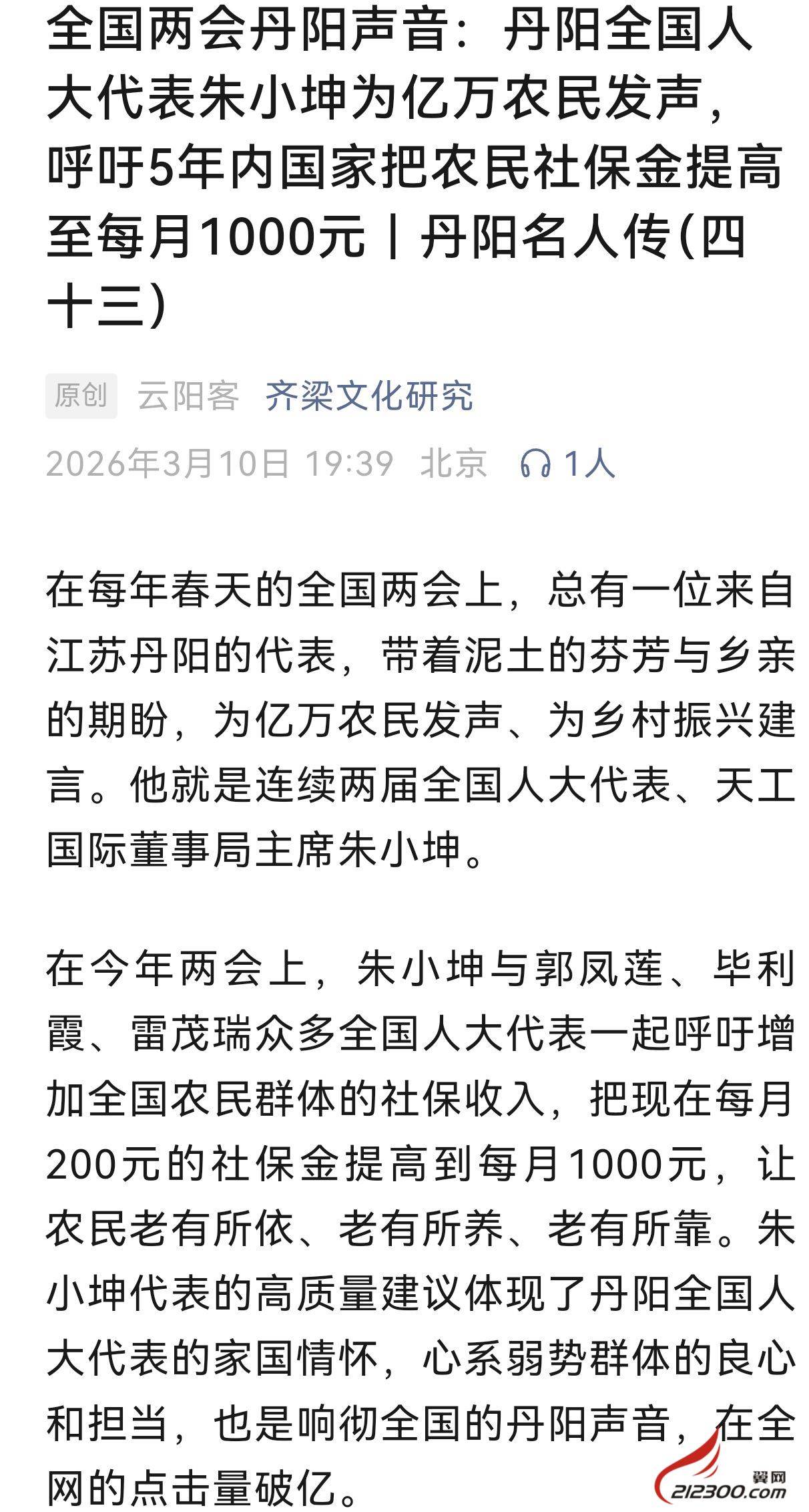 丹阳人大代表朱小坤同志心系农民,呼吁5年内把农民养老金提高到1000元