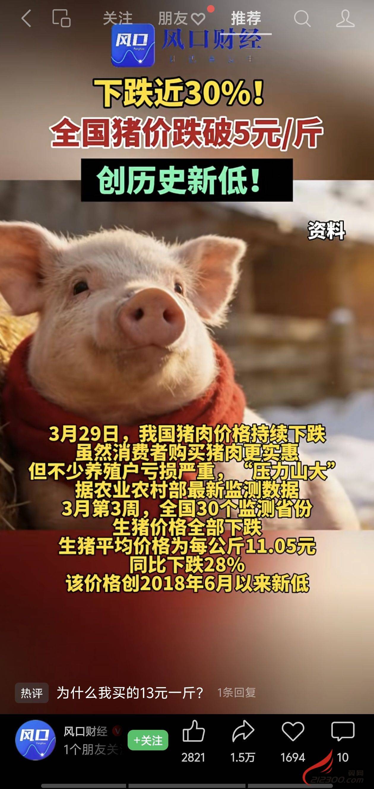 下跌30%!全国猪价跌破5元/斤